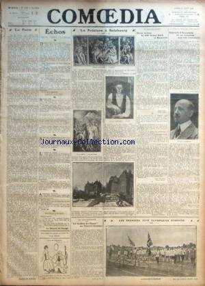 COMOEDIA [No 3536] du 21/08/1922 - LE POETE PAR ANDRE SUARES ECHOS - NOUVELLE A LA MAIN - LE MASQUE DE VERRE LA PEINTURE A SALZBOURG PAR CH. GIR LA CRISE DES SALONS - DEUX LETTRES DE MM. GRASS-MICK ET BESSERVE PAR RAYMOND COGNIAT LA SANTE DU POETE DE FOR CHE SI - GABRIELE D'ANNUNZIO NE SE REMETTRA QUE TRES LENTEMENT LES AVANT-PREMIERES - LE GRILLON DU FOYER AU NOUVEL-AMBIGU PAR L.-R. DU T. LES PREMIERS JEUX OLYMPIQUES FEMININS.