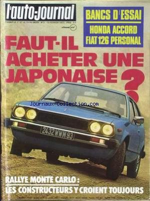 Descriptions AUTO JOURNAL (L') [No 3] du 15/02/1977 - HONDA ACCORD - FIAT 126 PERSONAL - LES JAPONAISES - RALLYE MONTE CARLO. livreHONDA ACCORD - FIAT 126 PERSONAL - LES JAPONAISES - RALLYE MONTE CARLO. .