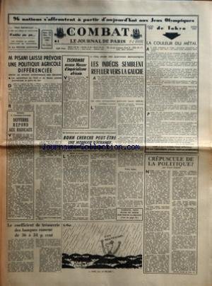 COMBAT [No 6314] du 10/10/1964 - 96 NATIONS S'AFFRONTENT A PARTIR D'AUJOURD'HUI AUX JEUX OLYMPIQUES DE TOKYO - LA COULEUR DU METAL PAR EMILE SERVAN SCHREIBER - M PISANI LAISSE PREVOIR UNE POLITIQUE AGRICOLE DIFFERENCIEE - DEMAIN A CLERMONT FERRAND - DEFFERRE REPOND AUX RADICAUX PAR D R - LE COEFFICIENT DE TRESORERIE DES BANQUES RAMENE DE 36 A 34 P CENT - TSCHOMBE ACCUSE NASSER D'IMPERIALISME AFRICAIN - EN INSISTANT POUR CREER LA FORCE MULTILATERALE CETTE ANNEE - BONN CHERCHE PEUT ETRE UNE MONNA
