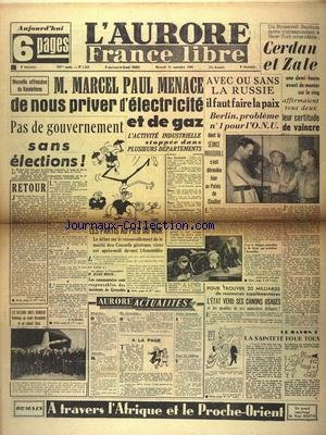 MARCEL PAUL MENACE DE NOUS PRIVER D'ELECTRICITE ET DE GAZ - PAS DE GOUVERNEMENT SANS ELECTIONS - AVEC OU SANS LA RUSSIE IL FAUT FAIRE LA PAIX - BOXE - CERDAN ET ZALE - LES NATIONS UNIES RENDENT HOMMAGE AU COMTE BERUADOTTE ET AU COLONEL SEROT